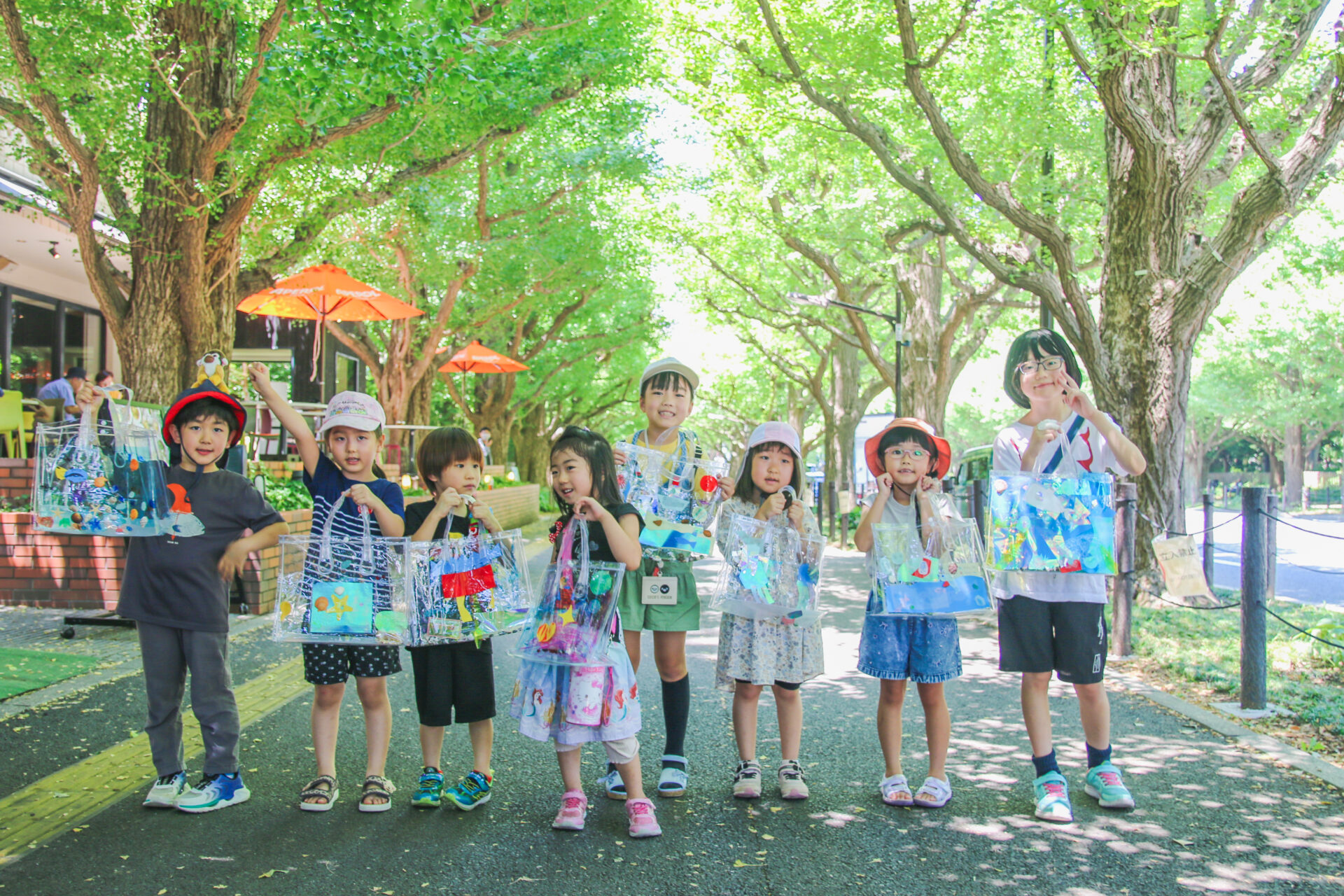 最後に、それぞれが作ったバッグを手に、みんなで外に出て記念撮影を行いました。