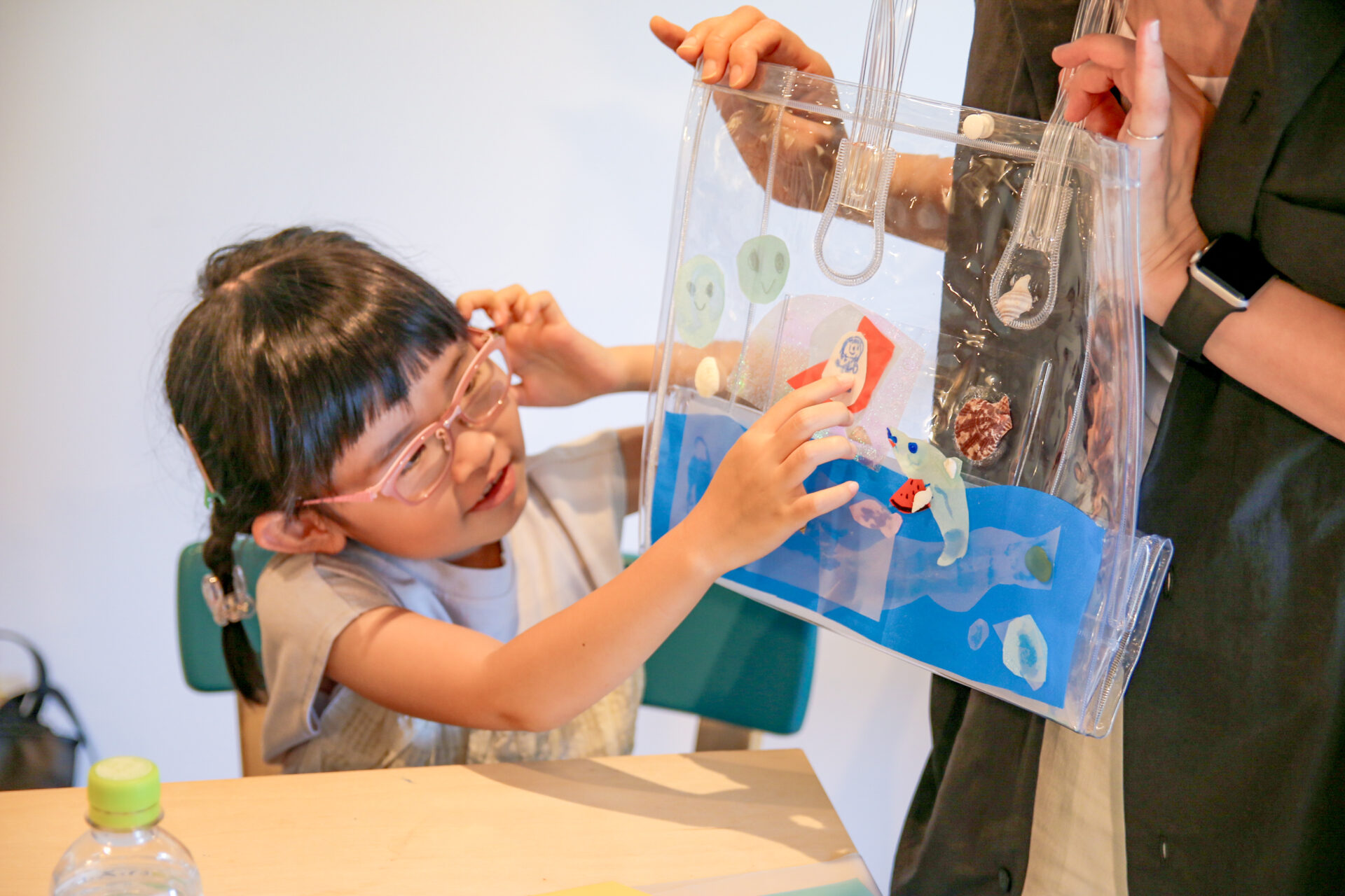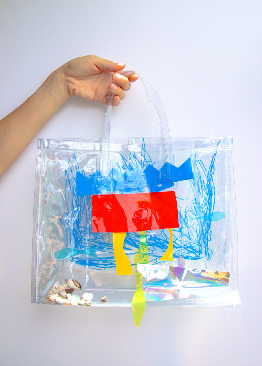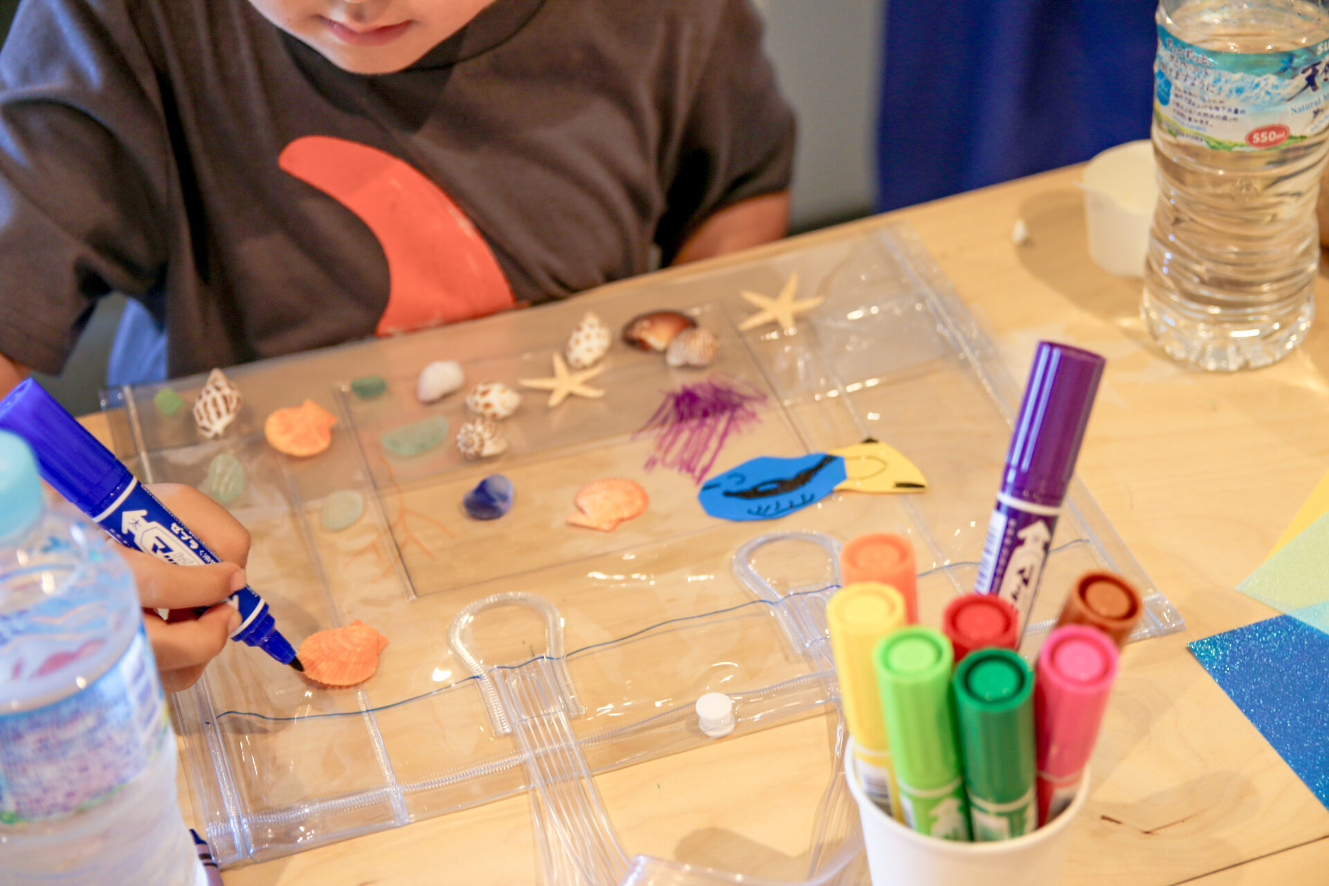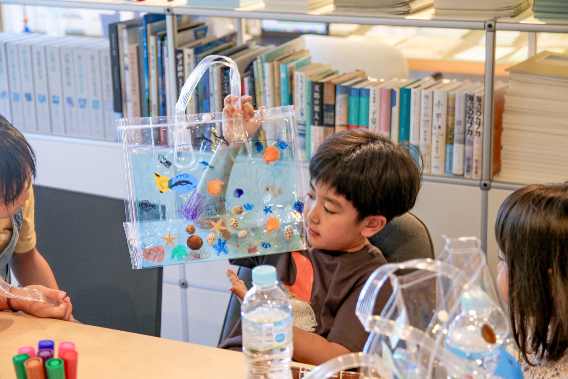素材である透明のバッグに思い思いの海を表現していきます。ルールはとてもシンプルで、海のどんなものを表現しても構いません。参考にしたい本や写真があれば、自由に手に取りながら作ることもできます。塩化ビニールのバッグに、貝殻などの素材を使って、子どもたちは切ったり貼ったり、直接ペンで描き込んだりしながら、それぞれの方法で自分らしい「海」を形にしていきました。