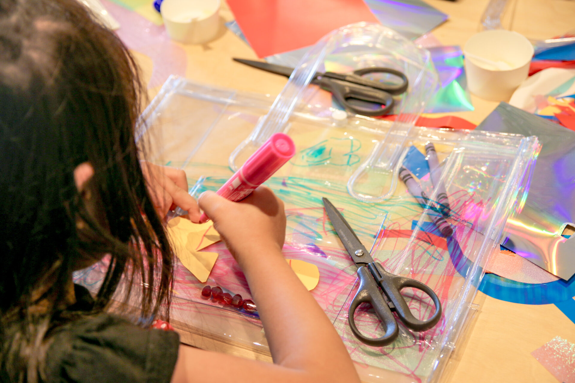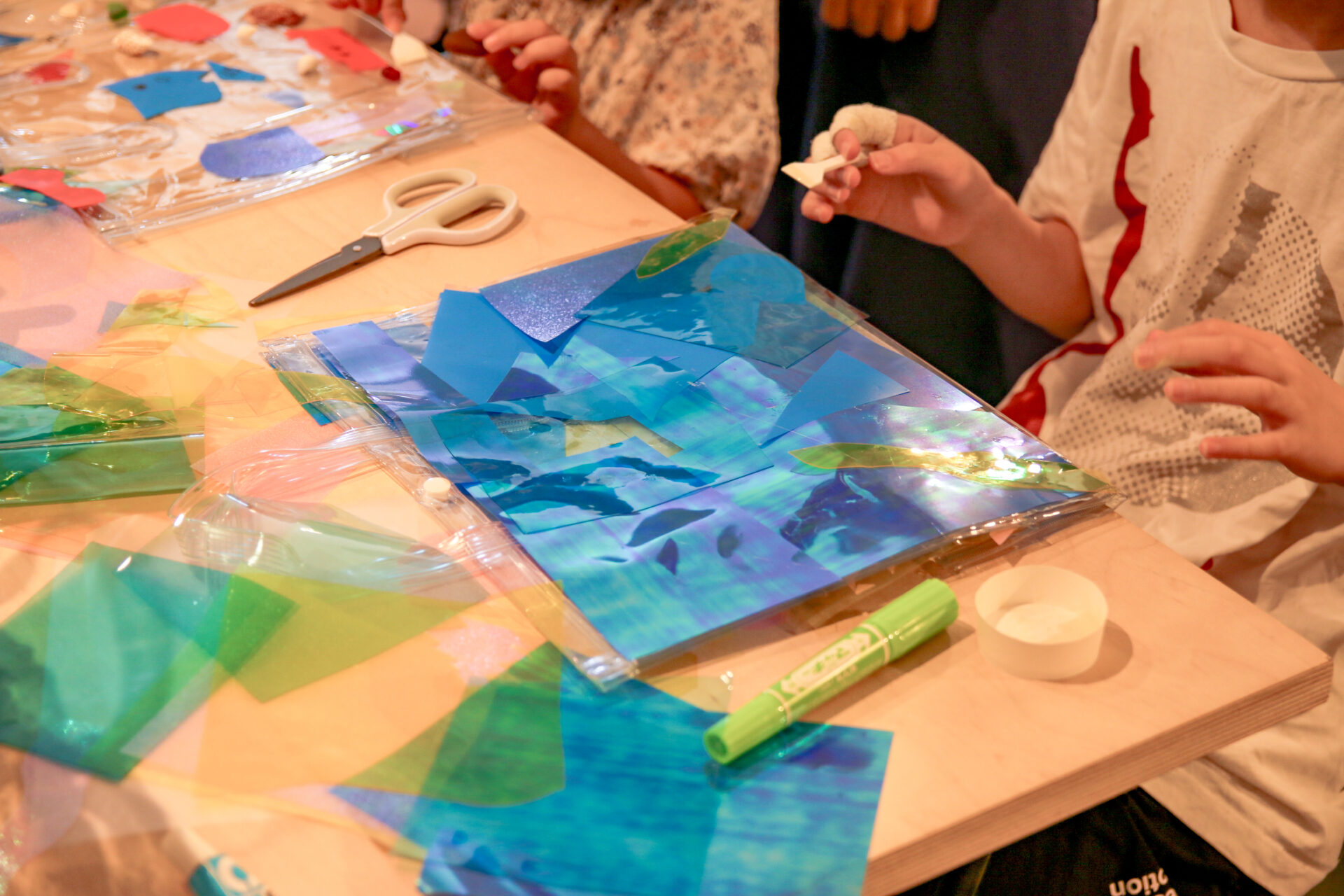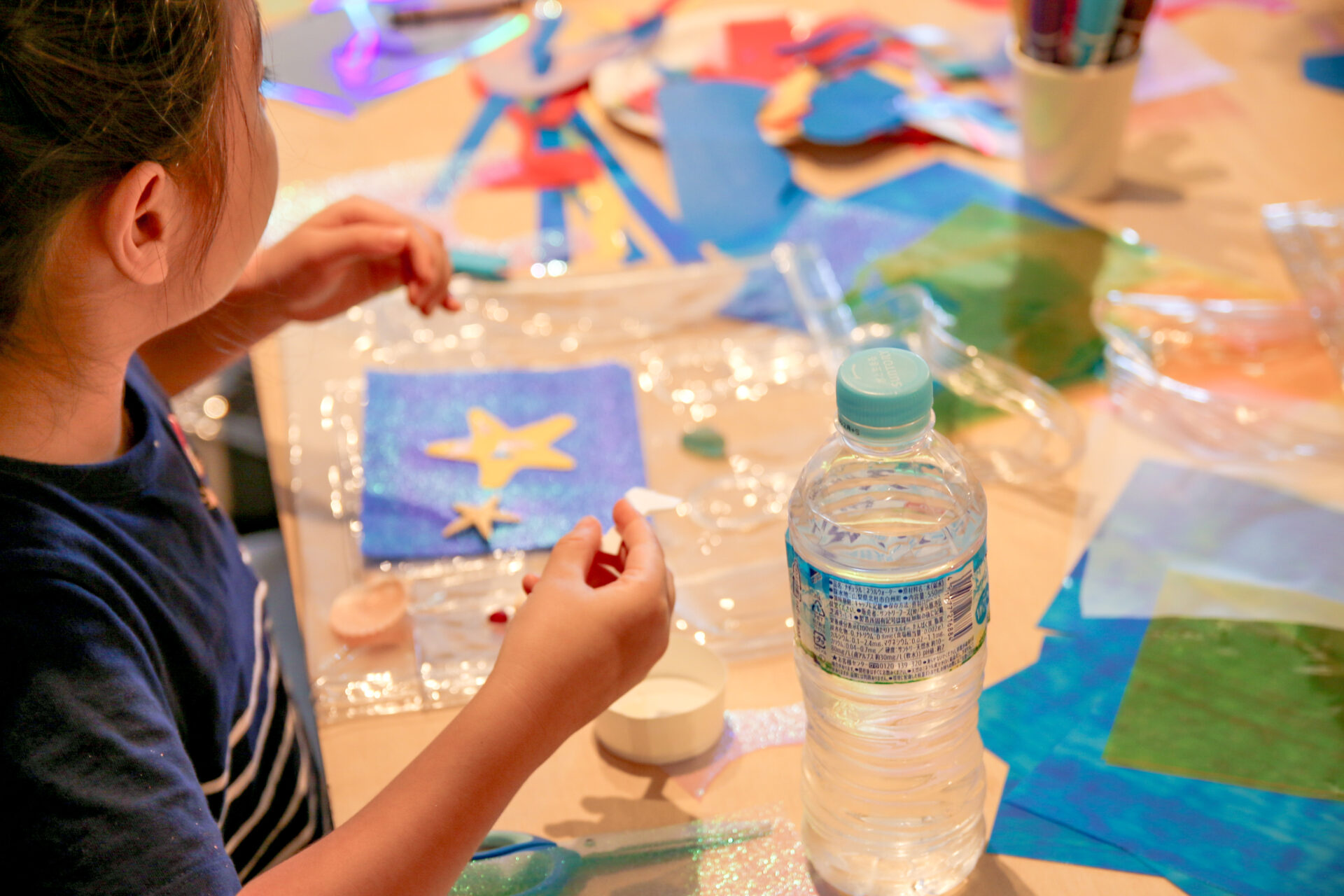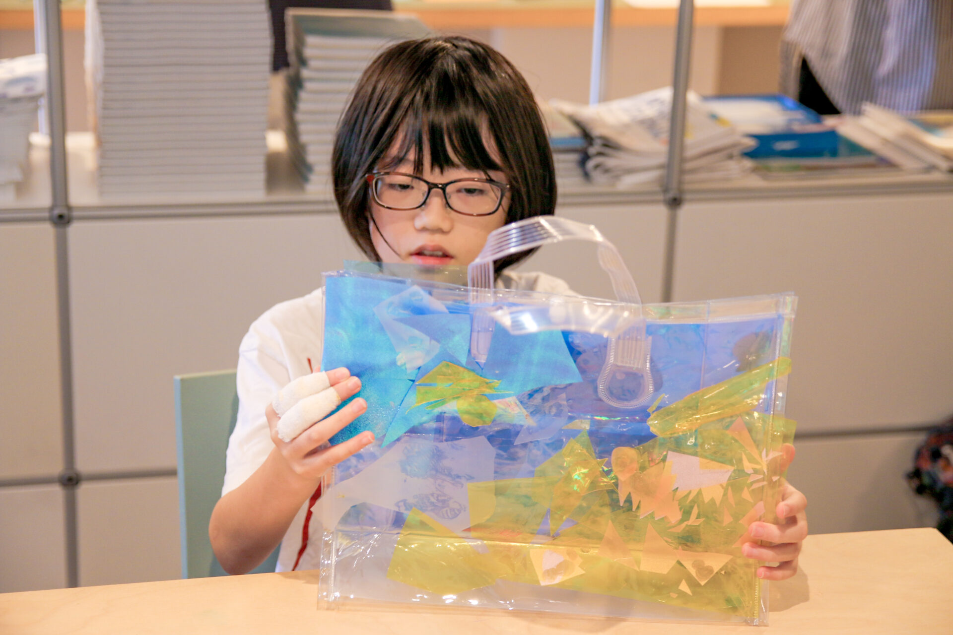 素材である透明のバッグに思い思いの海を表現していきます。ルールはとてもシンプルで、海のどんなものを表現しても構いません。参考にしたい本や写真があれば、自由に手に取りながら作ることもできます。塩化ビニールのバッグに、貝殻などの素材を使って、子どもたちは切ったり貼ったり、直接ペンで描き込んだりしながら、それぞれの方法で自分らしい「海」を形にしていきました。