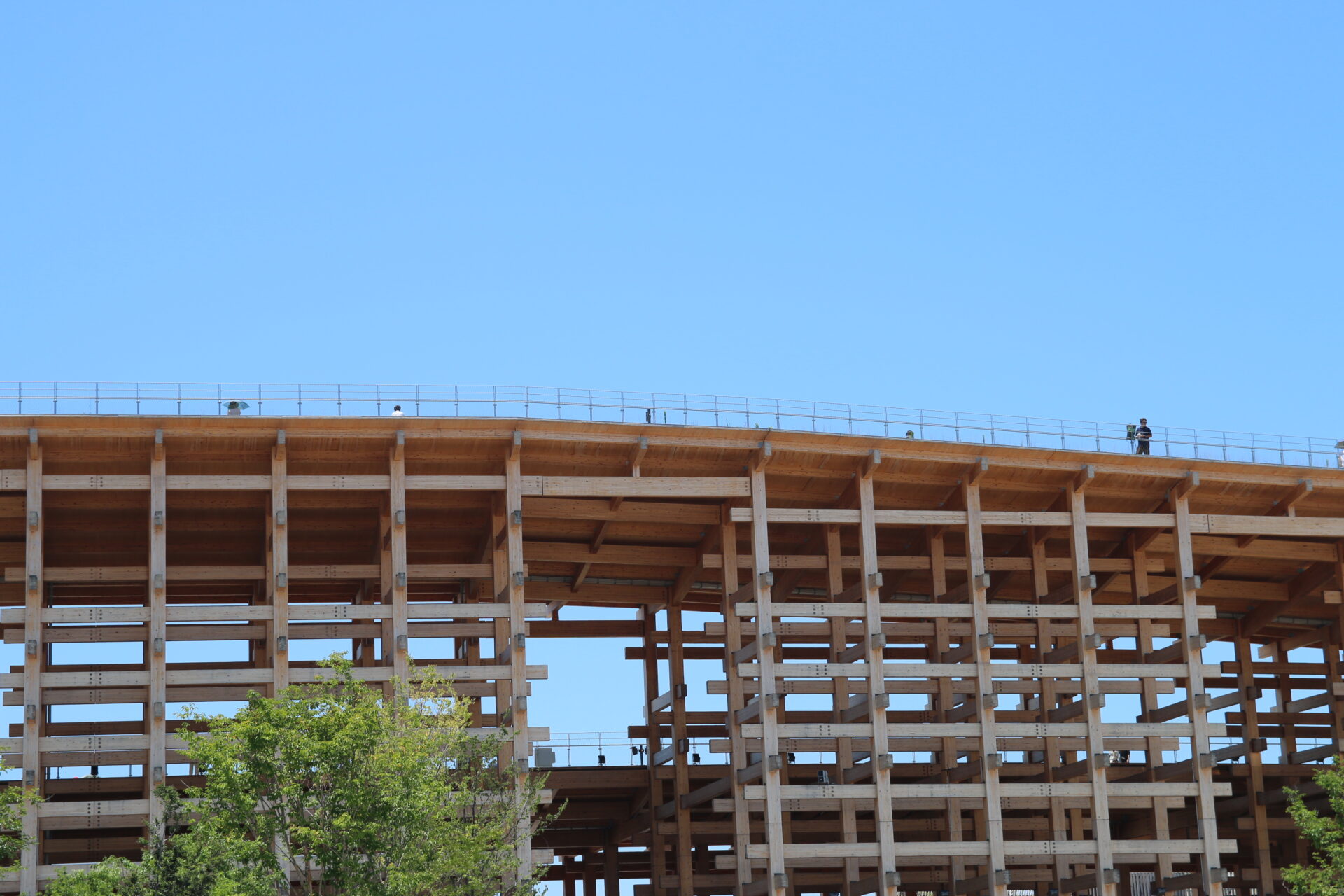 「いのちと、いのちの、あいだに」というテーマで、いのちの循環を展示と建築で表現した日本館。 展示を含むパビリオン全体をプロデュースするのはデザイナーの佐藤オオキ氏。展示会場はCLTという国産杉でできた合板をメインに使用した円環状の建築で「循環」を表現。また内と外が緩やかにつながる設計で、来場者がパビリオンのテーマとなる「あいだ」が意識できる仕掛けになっています。