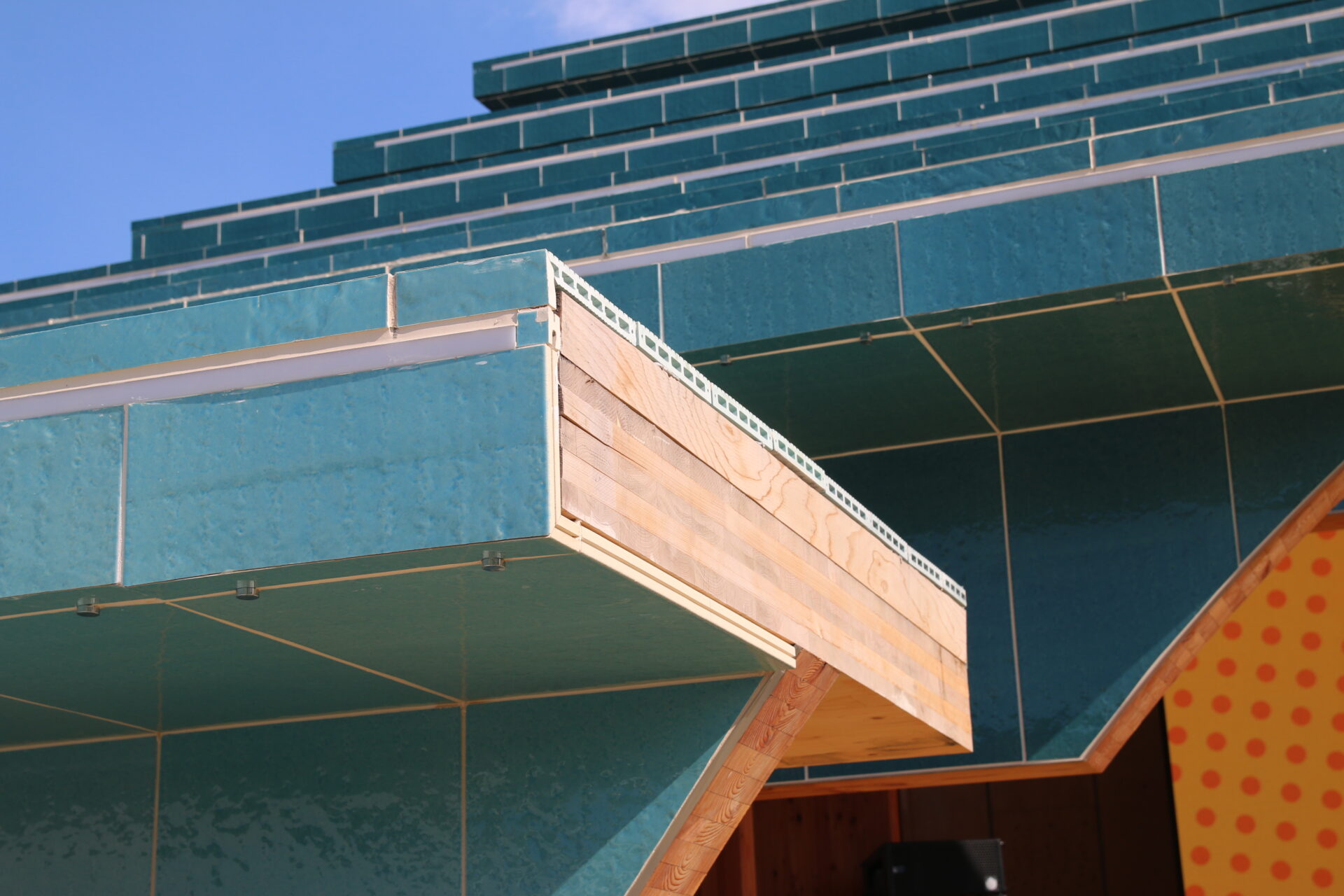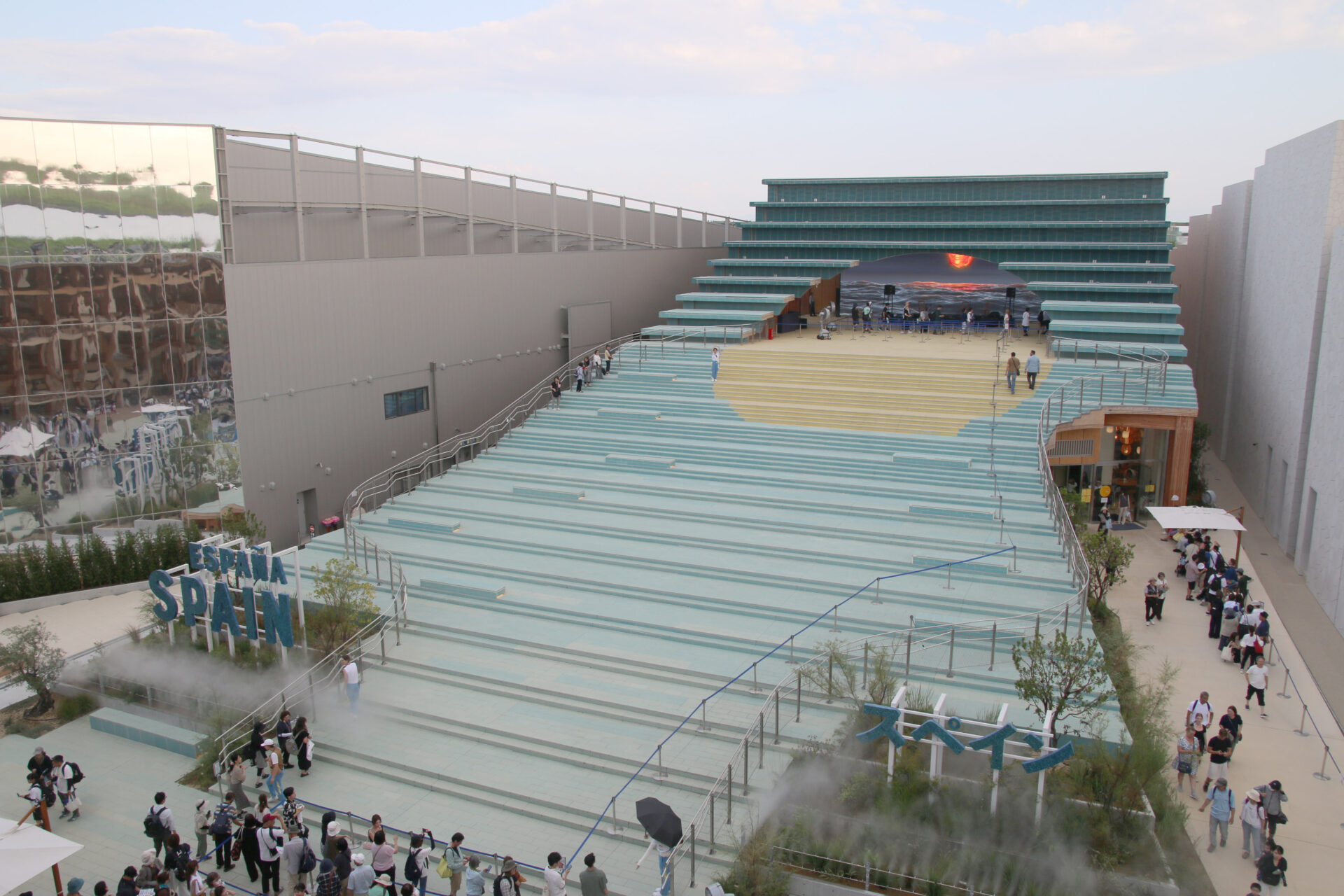 スペイン館は「太陽と海」の要素から形作られた建築で、上から見下ろすとまるで海を描いた風景のように見えるデザインです。外観は木造の構造体にカラフルなタイルを施し、地中海の明るさを感じさせます。エントランスに掲げられた「SPAIN」の文字は、廃棄された漁網をリサイクルした素材でつくられたものです。館内展示は、来場者が海中へと潜っていくような構成で進行し、光や映像、音響によってスペインの自然と文化を体感できる仕掛けが随所に施されています。