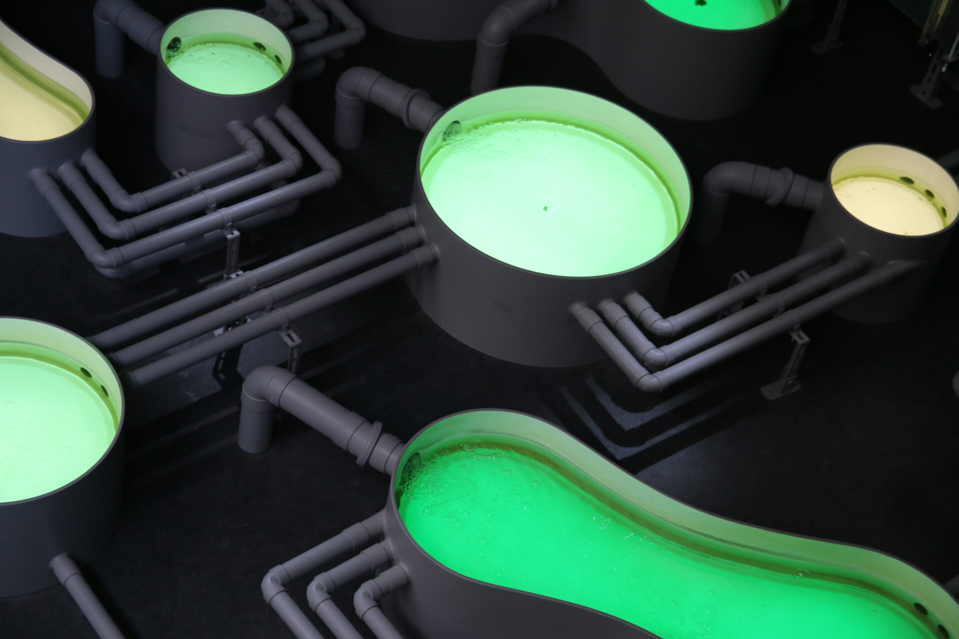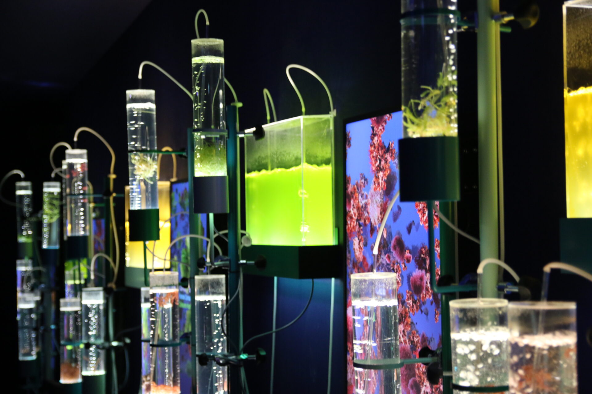 続く空間は、チューブ状の装置が美しく配置されたフォトバイオリアクターです。チューブの中には栄養価の高い藻類のスピルリナを培養し、少量の水や光で効率よく光合成ができる仕組みになっているそう。これを砂漠などの水の少ない地域で活用すれば、栄養不足が解決できる可能性があるといいます。