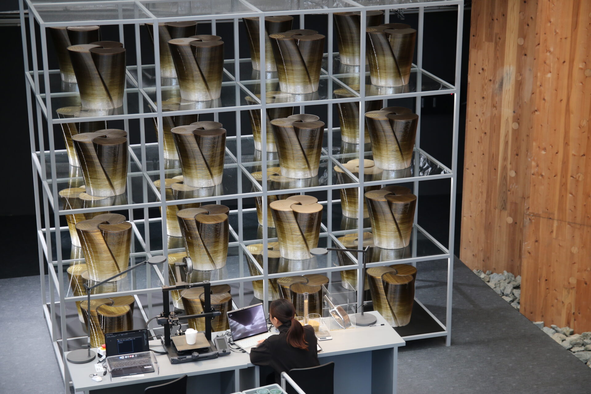 会場内で休むために用意されているのは、3Dプリンタで造形したスツール。ファームエリアで紹介されていた藻類を粉末化し、バイオプラスチックと混ぜ合わせた素材を、3Dプリンターで成形したものです。美しいグラデーションや、日本伝統の継ぎ手構造を活かした組み立て・分解の容易さなどが特徴で、日本館の3つのエリアをイメージした3パーツで構成されています。