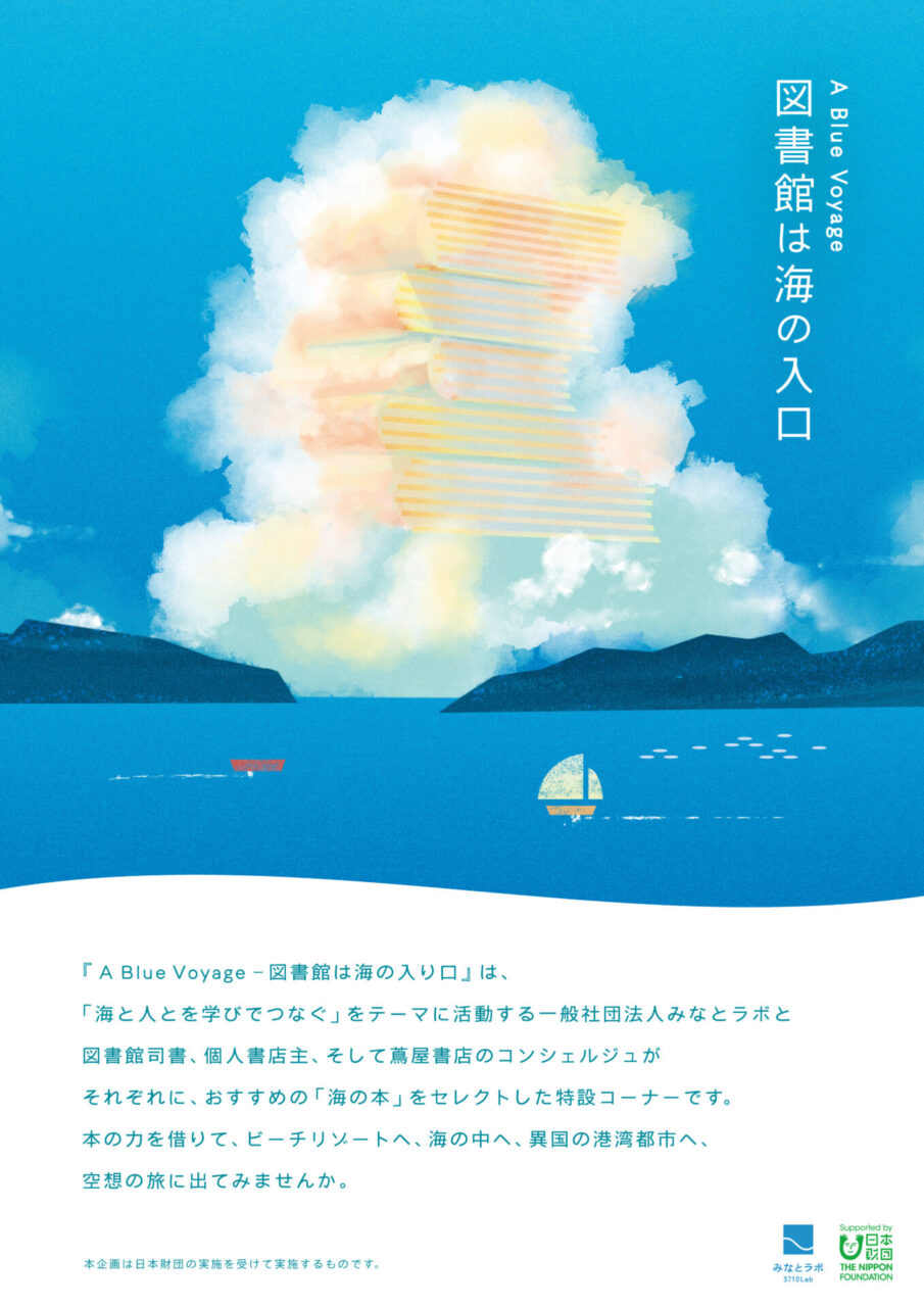 みなとラボは2024年度より、「海」について考えるきっかけを全国に届けるキャラバン企画「本屋は海の入口」を日本財団の助成により展開しています。このキャラバンは、2024年3月にみなとラボが刊行した書籍『個人書店が選ぶ、いま読んでほしい 海の本』の出版を記念してスタートし、これまで全国各地の書店や図書館で、海にまつわる本を紹介してきました。そのキャラバンをさらに続けていくべく「A Blue Voyageー 図書館は海の入口 」として、企画化!