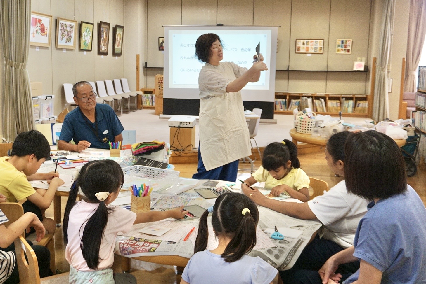 会期中には、海の思い出を題材に絵本を作るWSを開催しました。8人が参加し、絵本作家・川原雅さん(61)からレオ・レオニ作の『スイミー』などを読み聞かせてもらい、それぞれの海の思い出をもとに絵本を作っていきます。