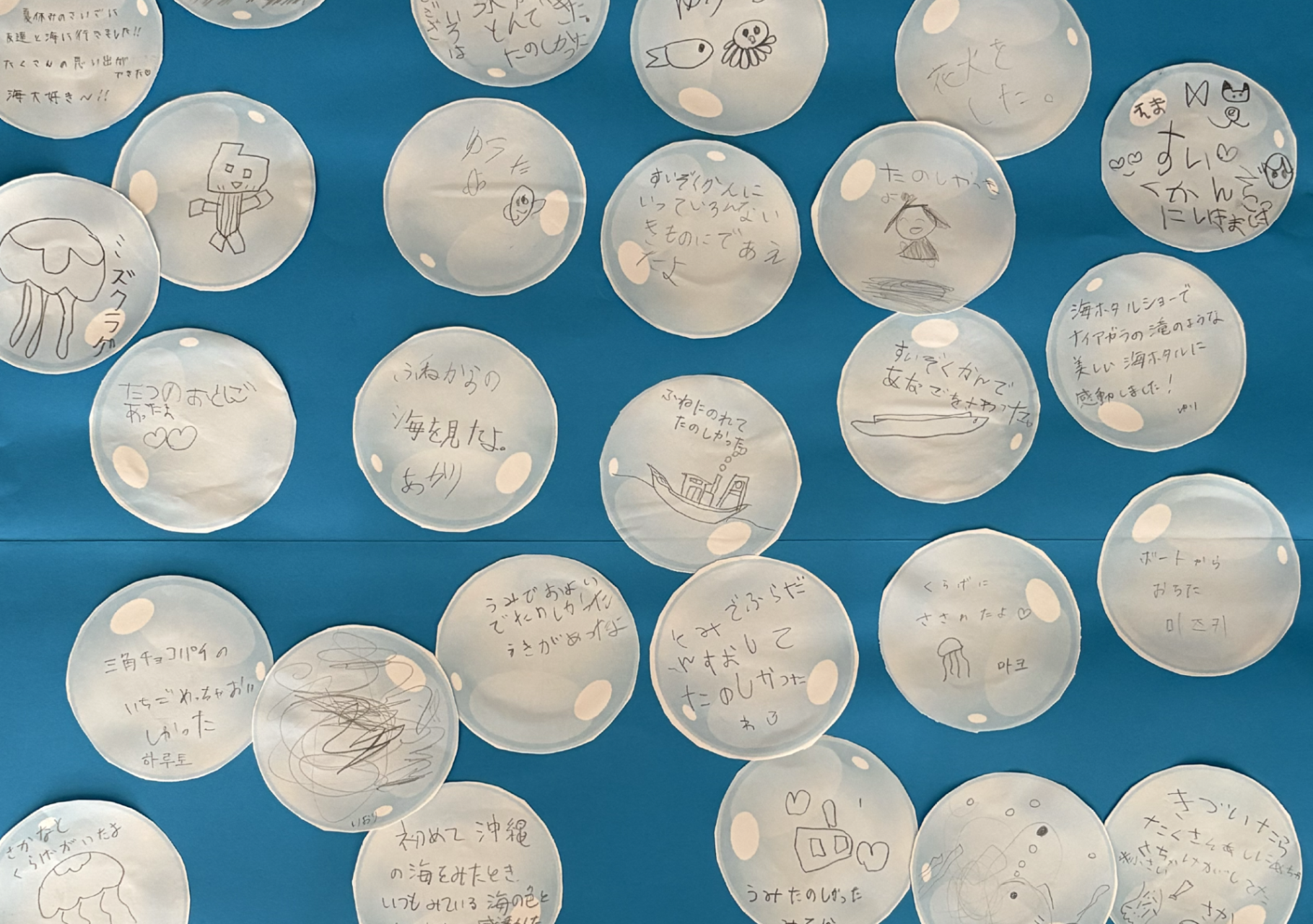 「海の思い出をかいてください」というコーナーでは、泡の付箋にたくさんの海の思い出が寄せられました。特に、海で遊んだ楽しい思い出がとても多かったです。