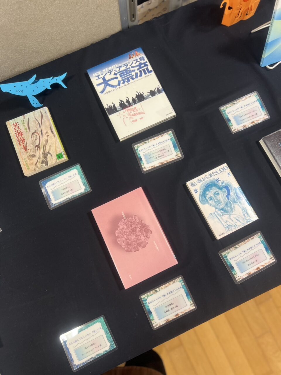 東浦図書館では海の思い出を付箋に書いてもらうコーナーと、みなとラボの書籍コーナー、図書館の方が選書した海の本コーナーが並びました。海の生物など、切り絵の折り紙が散りばめられ、温かみのある展示でした。