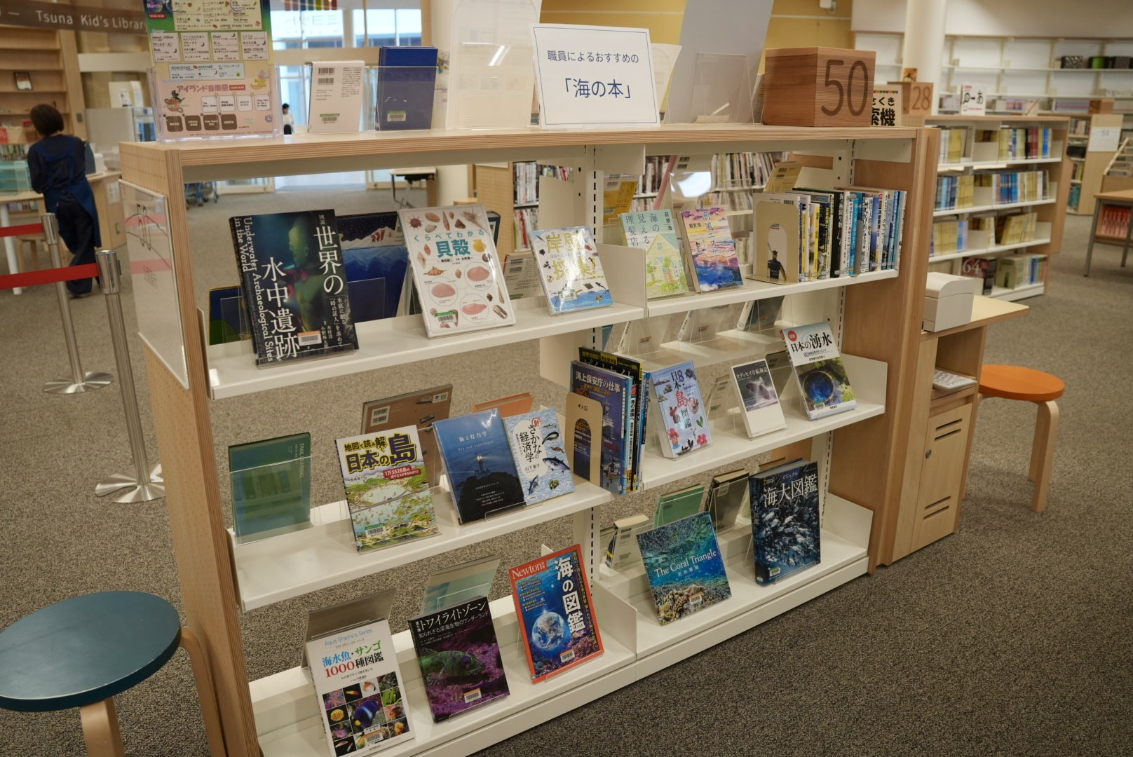 兵庫県淡路市津名地区の志筑新島にある津名図書館では、みなとラボ出版の書籍コーナー、Read the Seaで紹介してもらった本コーナー、職員の方が選書した本コーナーが並びました。