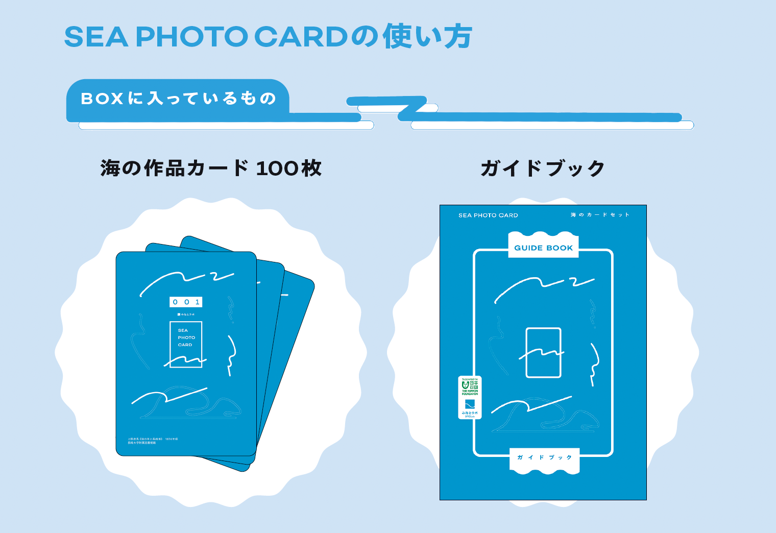 『SEA PHOTO CARD』のBOXには、海の作品カード100枚と一緒に「ガイドブック」が入っています。